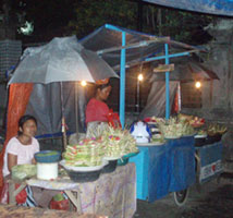 Nasi Jenggo sebenernya adalah nasi campur atau nasi rames yang dibungkus sama daun pisang. Mirip nasi kucing yang ada di Solo 🙂 Ukurannya kecil. Harganya berkisar antara 1000 sampe 1500 perak, mata uang lokal, tergantung pilihan lauknya, ayam, daging sapi, telur atau ikan. Lauk2 tadi biasanya didampingi dengan sedikit mie goreng, kering tempe dan sambel. Semua dalam porsi kecil 😀 Saya sempat berpikir, mungkin dulu nasi jenggo ini adalah miniatur nasi bungkus yang ada di Jakarta 🙂 Biasanya orang beli nasi jenggo ini beberapa bungkus sekaligus. Untuk mengenyangkan 1 perut lapar, standard orang asia, mungkin perlu 3 sampai 4 bungkus nasi jenggo. Bisa juga lebih kalau orangnya bener2 kelaparan atau kesurupan :-p Sempat terlintas di kepala saya, kalau rata2 1 orang makan nasi jenggo sebanyak 3 bungkus, kenapa tidak dibuat saja nasi bungkus dengan porsi lebih besar, dengan harga 5000 rupiah per bungkus misalnya. Nasinya sendiri mungkin bisa dikasih nama lain yang lebih mencerminkan porsinya, nasi bagong misalnya. Sayang, pikiran2 itu ga sempat saya diskusikan dengan siapa pun waktu itu. Terlalu sibuk 🙂