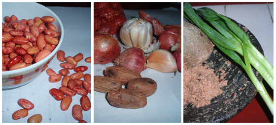 – haluskan bawang merah, bawang putih, lada dan pala. masukan dalam rebusan kacang dan daging. aduk rata