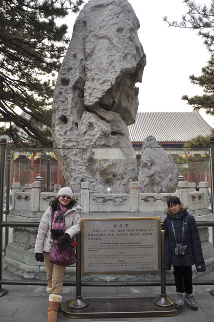 katanya, buat orang china ada 3 elemen penting yang sebaiknya ada di dalam sebuah taman. air, kayu dan batu. di summer palace, air jelas banyak. kan ada danau segede gambreng di sana. kayu juga ga kurang2 jumlahnya. selain banyak pohon, sebagian besar bangunan di sana juga terbuat dari kayu. untuk urusan batu, kaisar dan keluarganya juga punya koleksi sendiri. salah satunya adalah batu gede yang dipajang di salah satu halaman gerbang istana. konon, batu ini adalah hadiah dari sang kaisar untuk ibundanya. beliau jatuh cinta pada pandangan pertama dengan batu itu karena bentuknya yang unik, mirip gambar orang yang sedang berdoa 😀