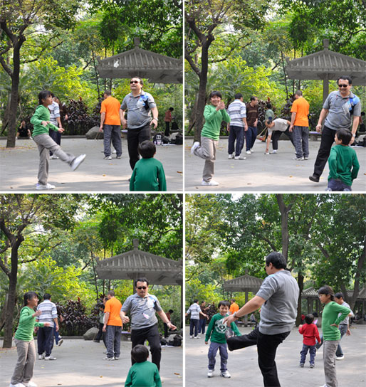 selesai berfoto2 dengan para kekambing itu, kami berjalan menuruni bukit dan sampai di sebuah lapangan. sambil beristirahat dan ngobrol2, anak2 dan bapak mencoba sebuah permainan tradisional disana: sepak bulu. mirip dengan sepak takraw. cuman kalau sepak takraw yang ditendang2 itu bola rotan, kalau sepak bulu ini yang jadi obyek tendangan adalah sebuah mainan kecil dengan bulu ayam di atasnya. mirip kok yang biasa dipakai untuk badminton.
