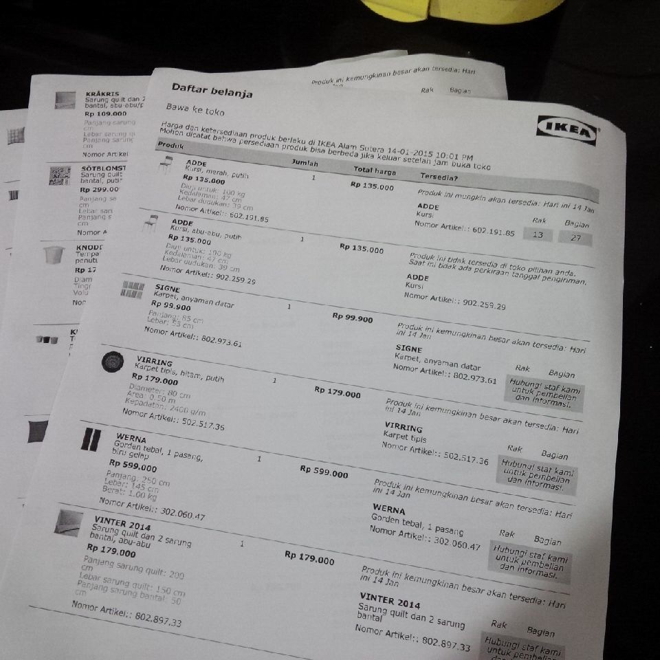 Iyaa…, jadinya kalau mau belanja di Ikea ini enak deh… Sebelum ke sana, kita bisa browsing katalog online nya dulu. Masukin barang2 apa aja yang mungkin mau kita liat atau beli. Nanti akan keluar daftarnya. Ada keterangan apakah stock nya tersedia atau ga. Kalau tersedia jumlahnya berapa, dan kalau ga tersedia, ada perkiraan waktunya kapan stock akan ada. Di daftar belanja itu juga ada informasi di rak dan bagian mana lokasi barang yang kita cari. Jadi saat belanja kita tinggal bawa print out daftar belanja kita aja.