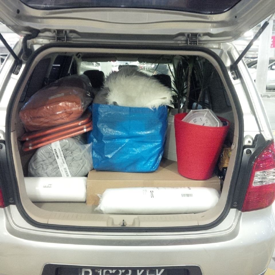 Dan ini adalah pengalaman saya yang pertama kalinya, beli sofa bed + nakas + kursi + lampu + bantal + karpet + jam dinding + tanaman dan lain-lain, dan pulangnya dibawa sendiri naik Grand Livina 😀