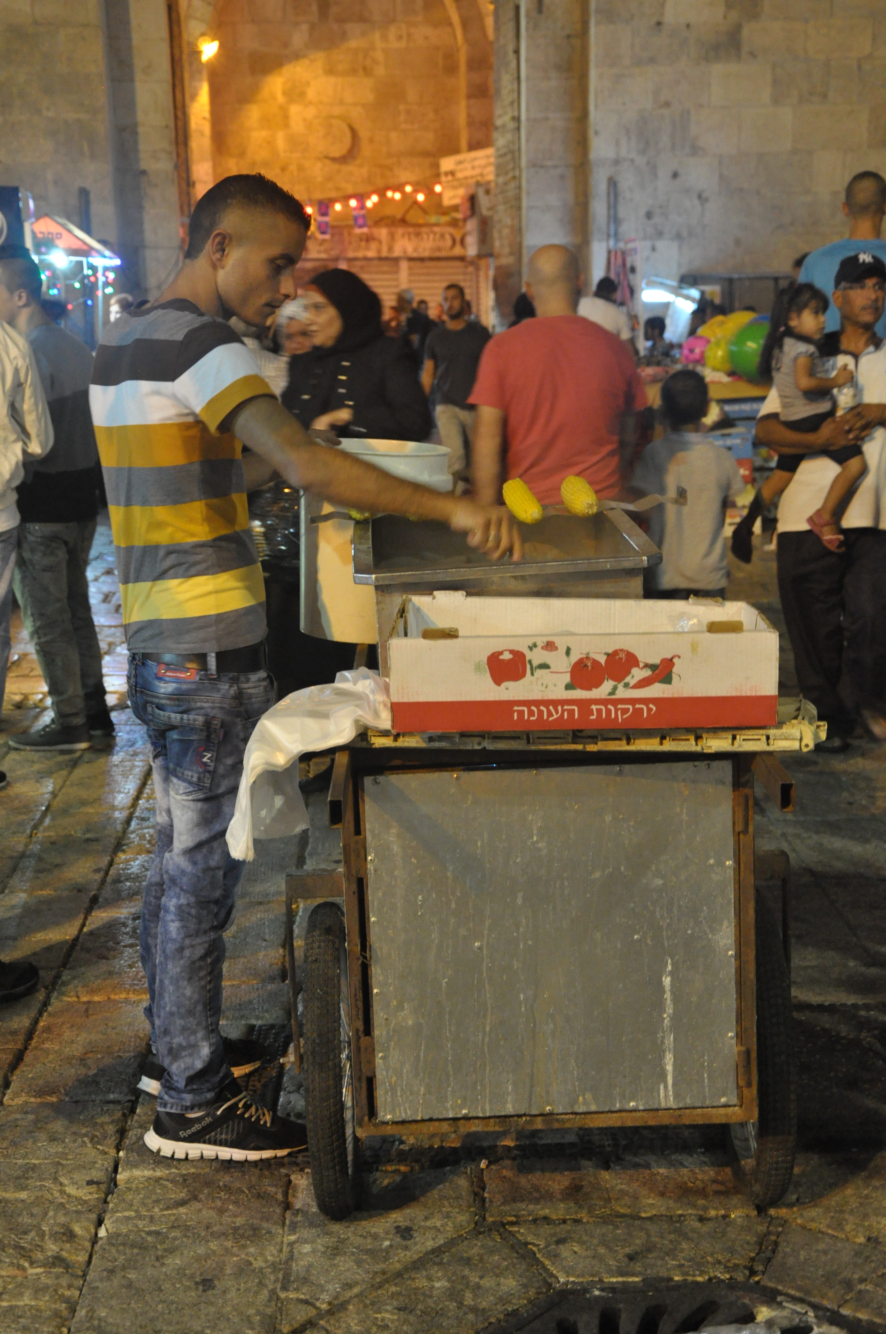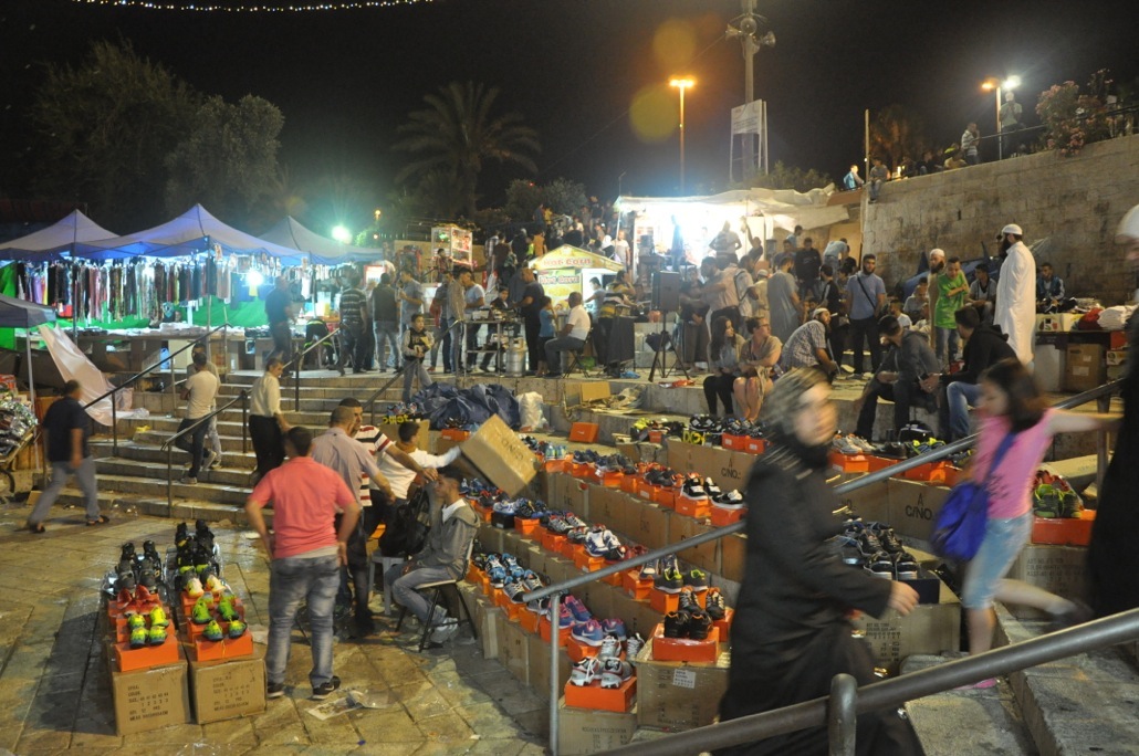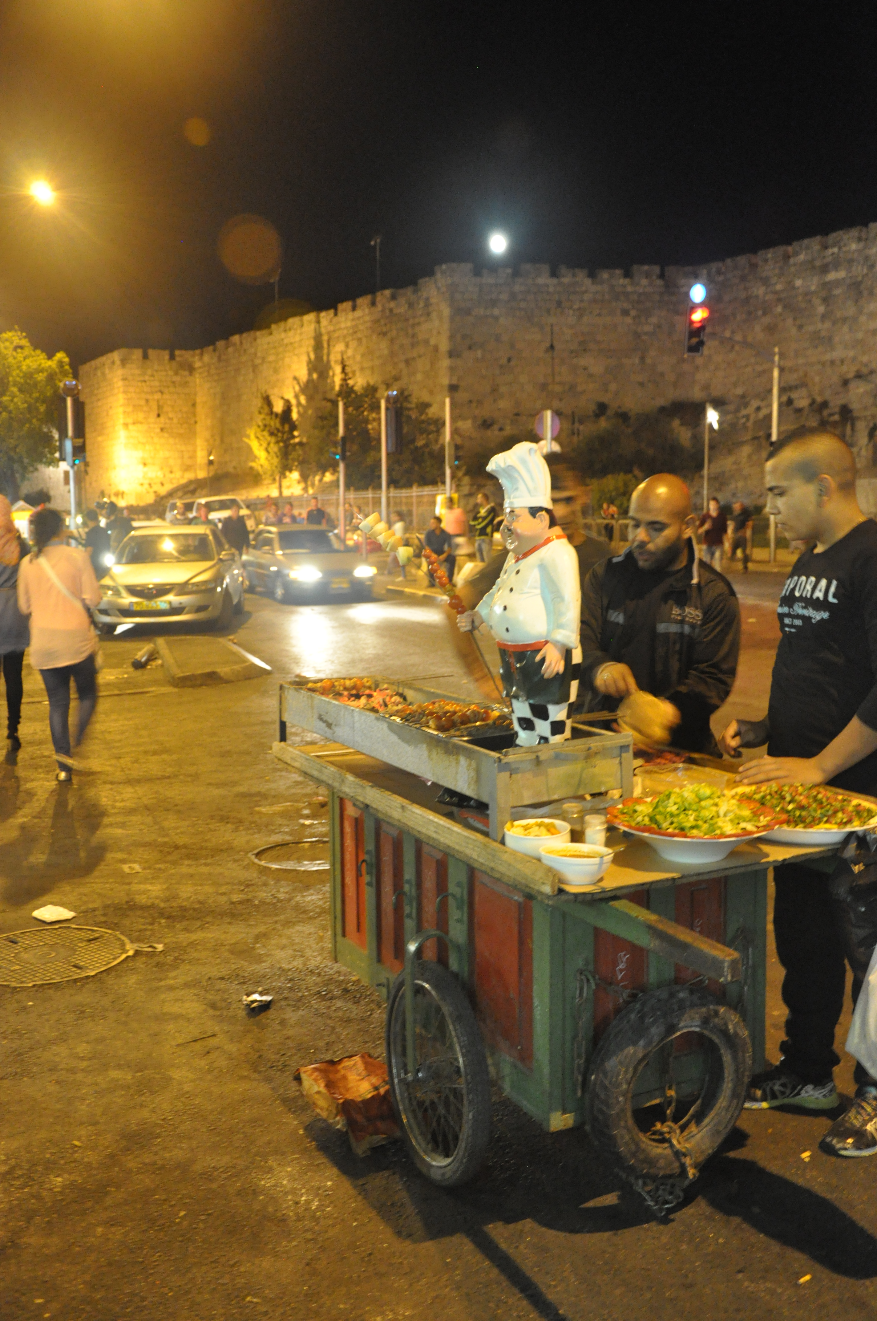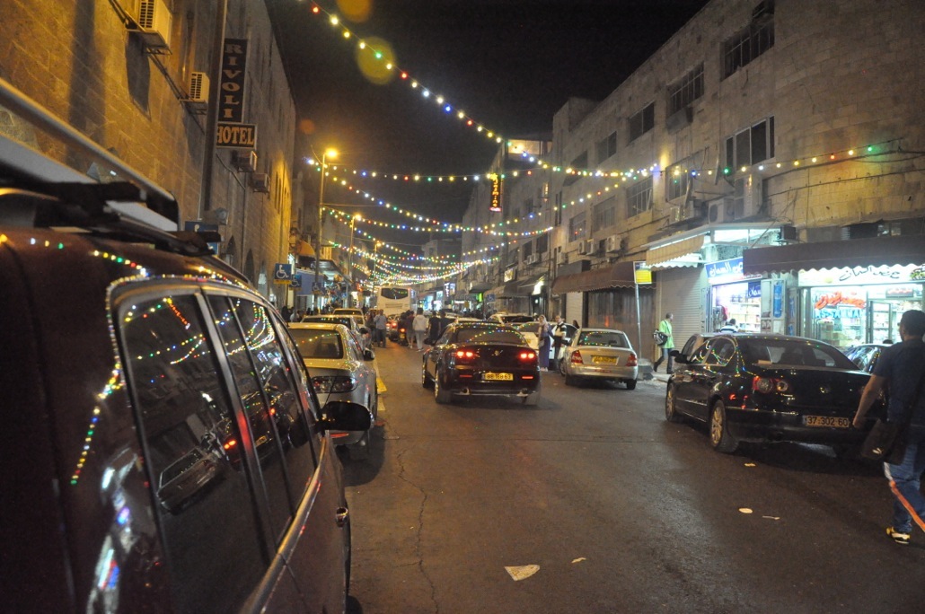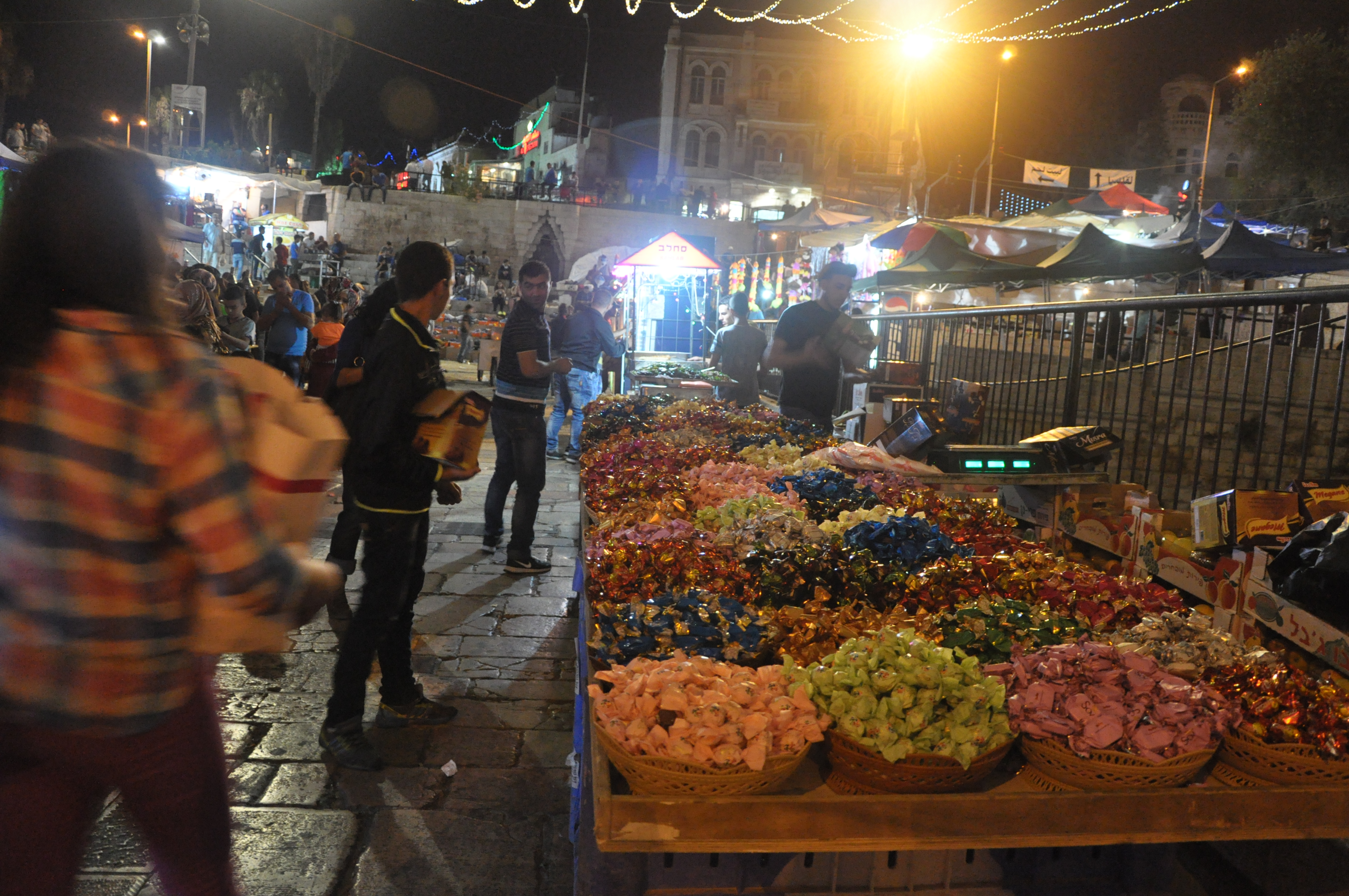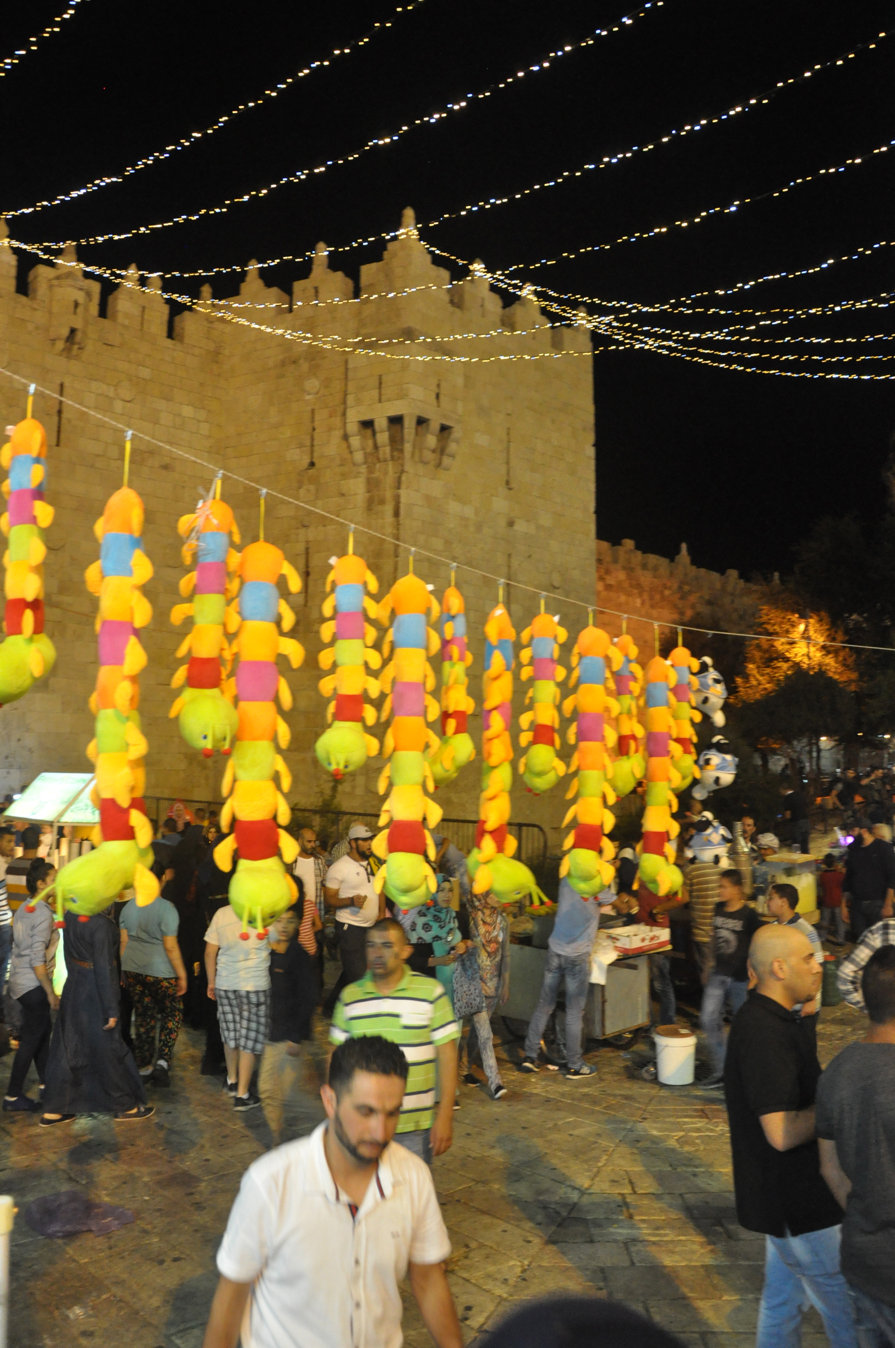 Kita bisa masuk ke moslem quarter melalui 3 pintu gerbang: Herod’s gate, Lion’s gate atau Damascus gate. Kami masuk melalui Damascus gate, karena letaknya yang paling dekat, sekitar 3 km dari hotel kami. Malam itu jalanan di sekitar damascus gate terlihat benderang dengan hiasan lampu yang berjuntai2. Puluhan kedai penjual makanan2 khas bulan Ramadhan dan pedagang kaki lima yang jualan berbagai kebutuhan lebaran juga turut menghiasi sepanjang jalan Sultan Suleiman. Mirip pemandangan di daerah tanah abang atau mangga dua di Jakarta.