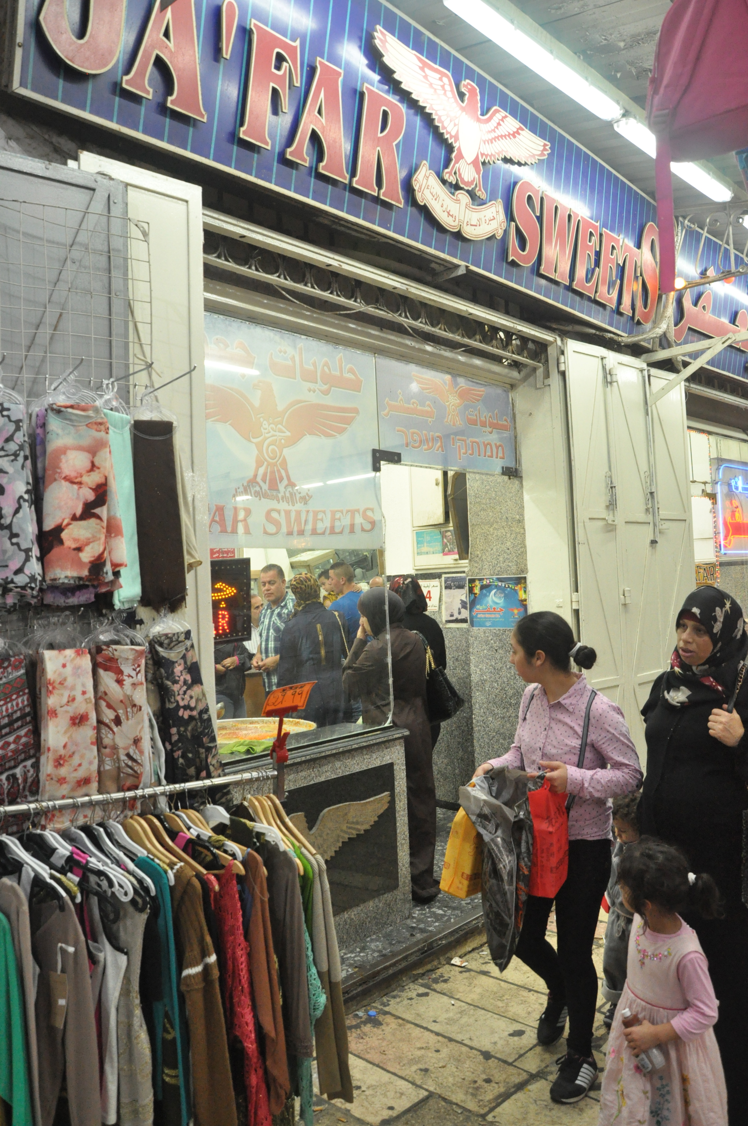Yang paling berkesan buat saya malam itu adalah saat Saber mengajak kami mampir ke Ja’far Sweets. Toko yang menjual salah satu makanan paling terkenal di Jerusalem: knafeh. Knafeh adalah sejenis dessert berupa cheese pastry yang direndam dalam sirup gula. Itu adalah pertama kalinya saya makan knafeh. Rasanya unik dan enak sekali. Ada kombinasi yang pas antara rasa gurih dari pastry, asin nya keju dan manisnya sirup gula. Benar2 lezaaatttt….. 🙂 🙂 🙂