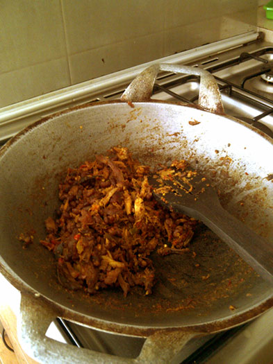 jaman saya kecil dulu, saat bulan puasa dan menjelang lebaran di kampung saya ada tradisi saling berkirim makanan antar tetangga. menu makanan yang dikirim bermacam2. tapi yang paling umum dan hampir pasti ada di setiap baki kiriman adalah sambel goreng kentang, tumis cabe ijo campur bihun/soun dan ayam goreng/empal.